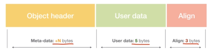 malloc(5)needs 3 bytes of padding, the object header then will take another +N bytes on top of that. So were’re actually adding some overhead to whatever memory we request