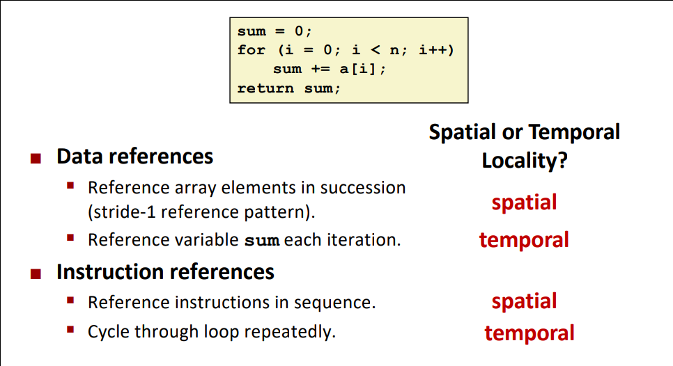 Programs tend to use data and instructions with addresses near or equal to those they have used recently. Two types, Temporal and Spatial. There are various access patterns based on this principle of locality. These not only refer to data but also to the instructions that get loaded into the CPU. As software developers we should have a good qualitative sense of locality; determine if a piece of code has good locality.