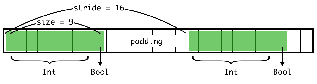[a,b,c,d] // say elements are some `struct`; here stride is size of the structs; having padding will change the stride.