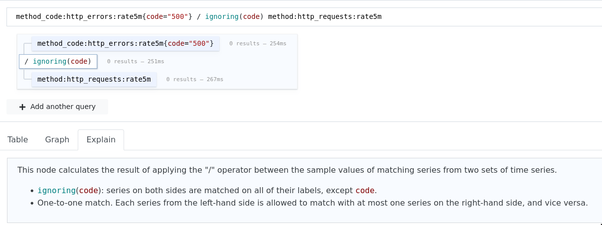 operationto happen betweeninstant-vector(s), they must “match”. To make things match, we can useonandignoringas needed. - Simply using