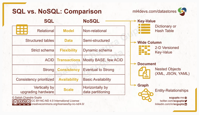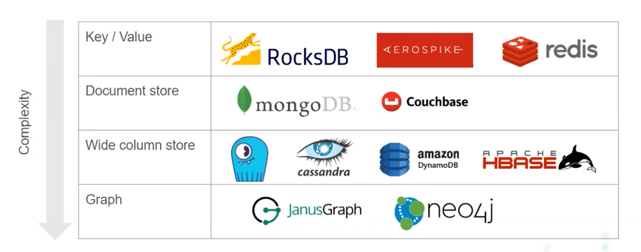 - NoSQL: Usually K/V, Wide Column, Document, Graph etc.