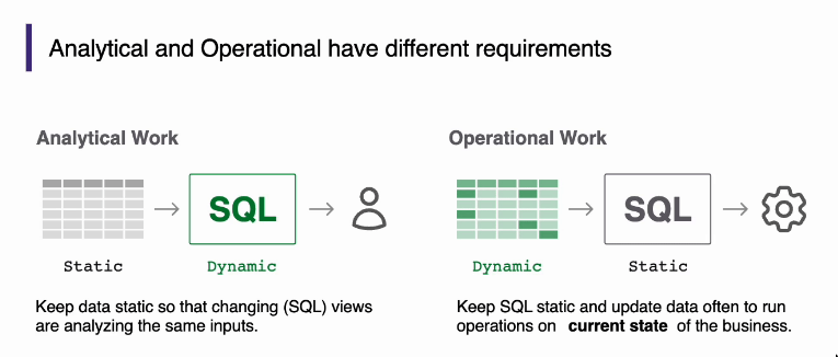 - Operational workloads have fundamental requirements that are diametrically opposite from the requirements for analytical systems