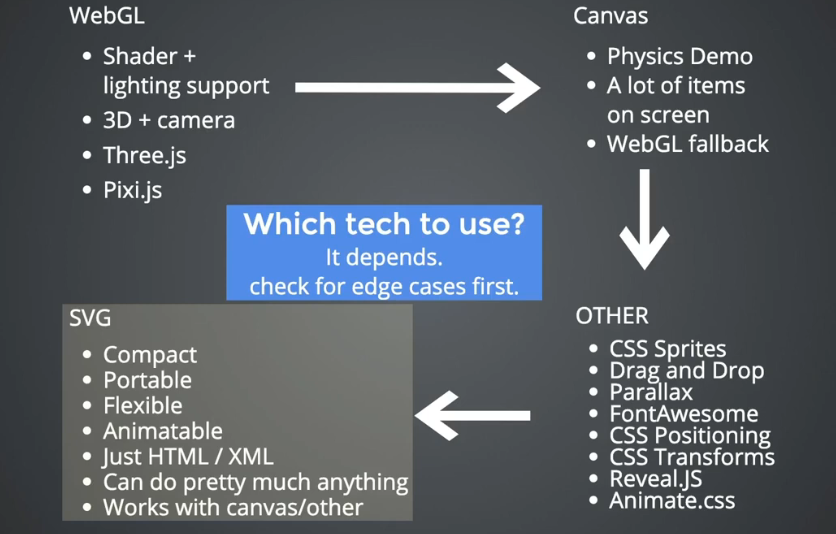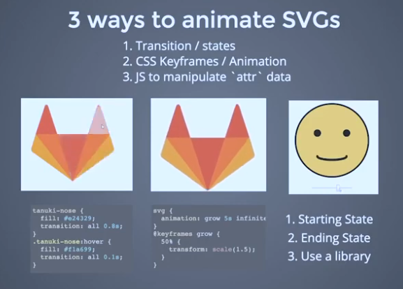- SVG: Since SVG is directly written into the DOM, we can do almost everything we can do with other dom elements.