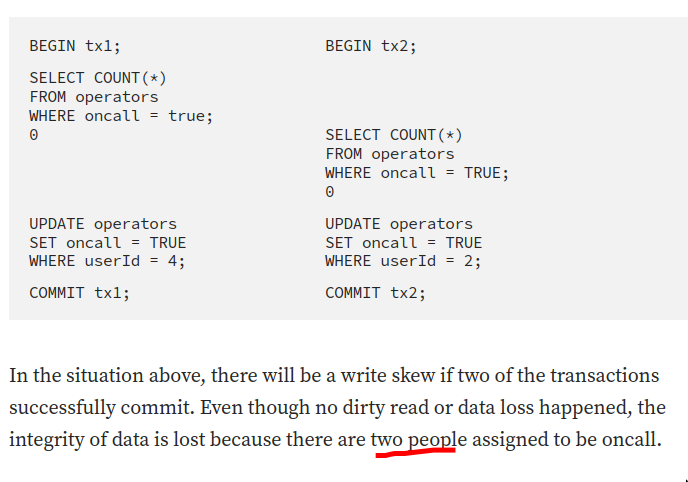 - Write skews: Logical anomaly. Logical constraints on data is compromised. Eg. set one person to oncall.