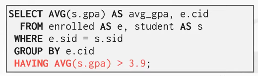 HAVING, syntax looks like we’re computingAVGtwice, but the database is smart enough not to do that. We useHAVINGbecauseWHEREis not aware of the computed value.