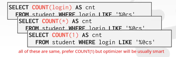 SELECT COUNT(1) FROM students;slow?” COUNT(*)counts rows as long as any one of their columns is non-NULL- In PostgreSQL