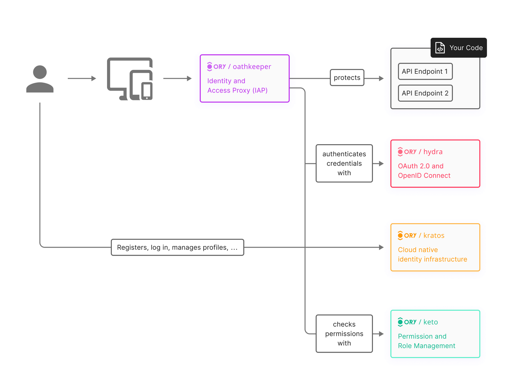 - Oathkeeper acts as the Policy Decision Point (PDP).