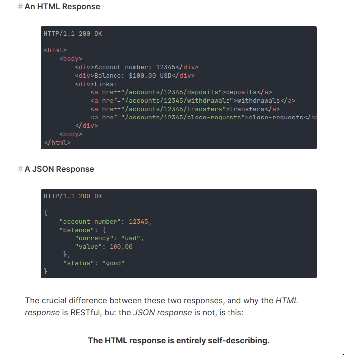 - The HTML response “carries along” all the API information necessary to continue interacting with the system directly within itself. Which is not the case with the JSON response, the client has to interpret the information of the JSON response and do certain logic based on it. i.e the response from the server is not sufficient to be delivered to the end user, which in the case of the HTML response, it is.