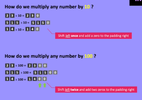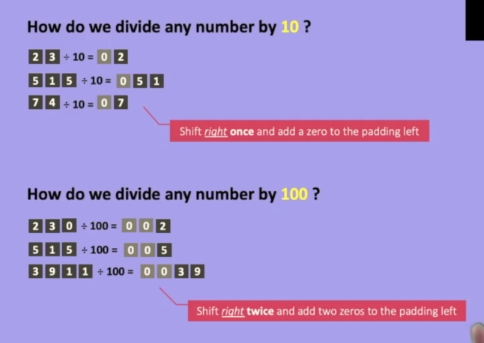 36 >> 2 = 36 >> 21 = 09 = 36 divided by 22