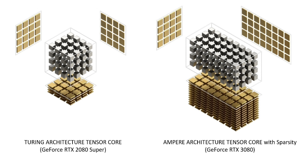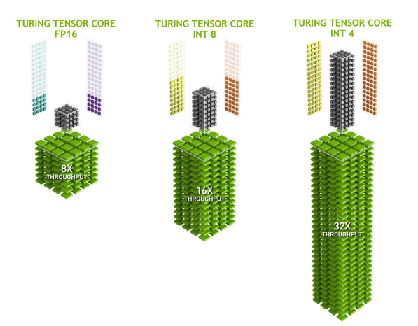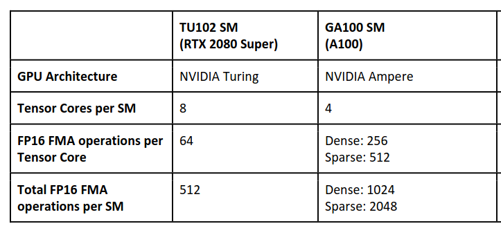 - CUDA cores each core can only do one multiply-accumulate(MAC) on 2 FP32 values