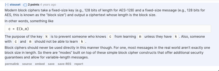 fixed-size key x fixed-size message = ecncryted message of block size- The different “modes” help operate block cipher