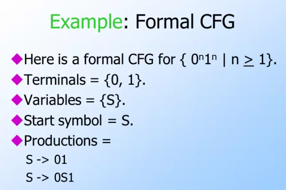 1 non terminals, CFG go brrr :) \[ L(G) = {a^nb^n|n \ge 1} \]