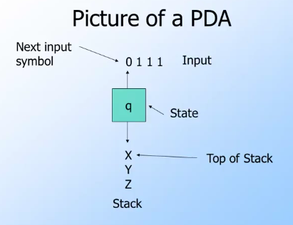 - Think of an ε-NFA with the additional power that it can manipulate a stack. It can use the stack to help choose the next move.