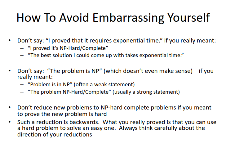 NP-harddirectly, but commonly we usereduction. - There’s a library of NP-hard problems that you can pick from, some of them are cleverly designed to be easy to be reduced to. Try to get a feel over time for which problems more easily lend themselves to different schemes, like packing, or covering, or traversing graphs.