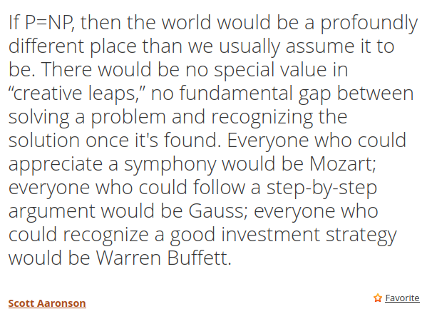 - But some problems like, 2SAT, XORSAT, Maximum Matching, and Linear Programming, these “seem like they should be NP-complete” at first glance, but then turn out to have clever polynomial-time algorithms.