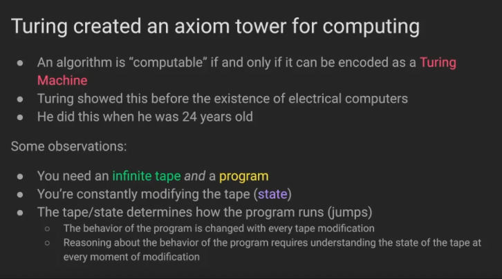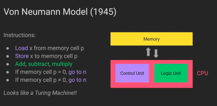- He did not follow the TM model exactly, instead he built on it. He introduced the “Logic Unit” which will do the computation like add, sub etc instead of going back and forth like the TM does.