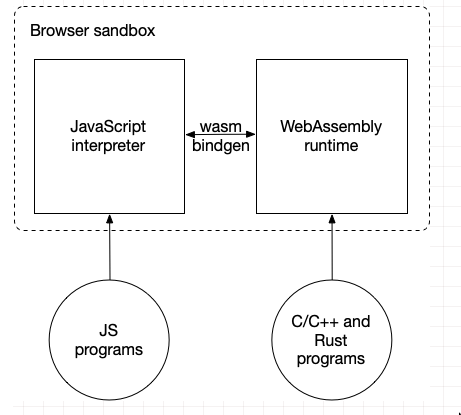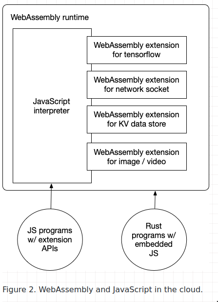 - To run JavaScript code, the runtime is compiled to WebAssembly, with your code running within the WebAssembly-hosted interpreter. This approach, which might sound inefficient, is surprisingly practical and increasingly popular.