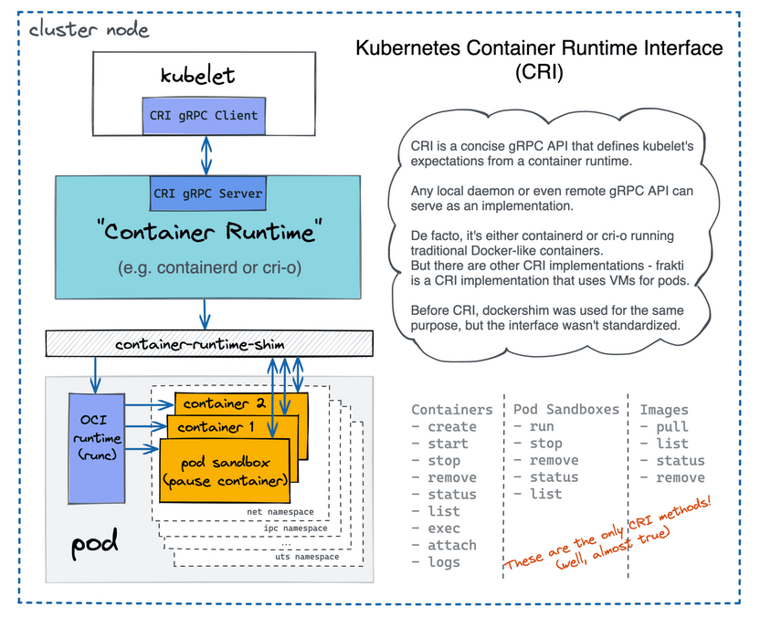 CRI-O - Uses grpc, doesn’t do things like talk to registry etc. without additional software, containerd doesn’t do anything differently from Docker, it just does less.