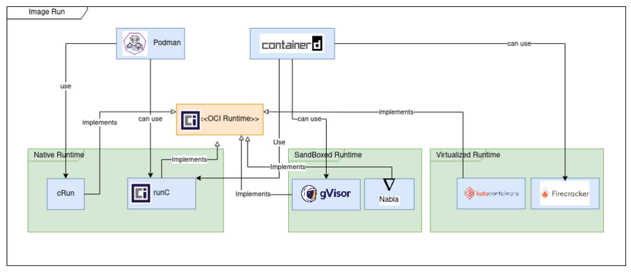 runc(created by Docker)crun(tries to be faster thanrunc)