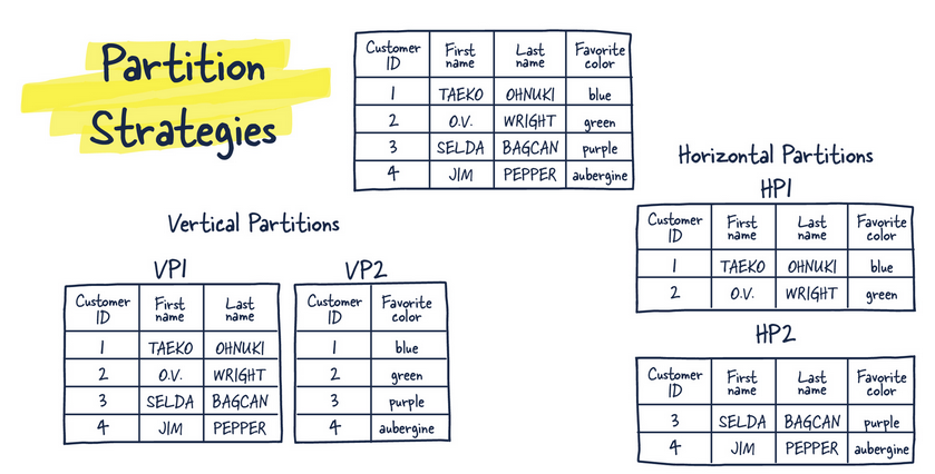 | Vertical | One that uses column-partitioning(usually application specific) | column-partitioning, similar to normalization | Scale up(beef up) |
