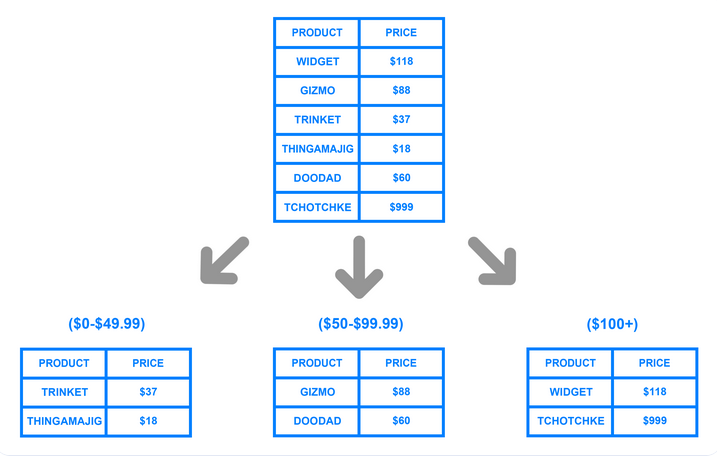- Divides the data into rows based on a determined key or range of values.