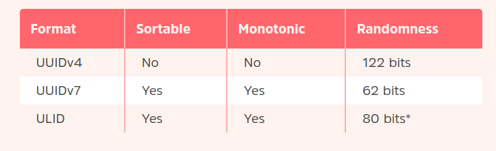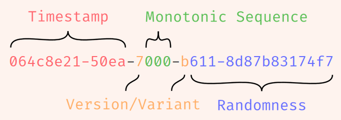 UUIDv7but there’s no defined monotonic counter. They have seq random sections.- Eg.