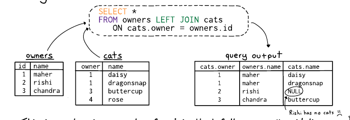 - Produces a complete set of records from Table A, with the matching records (where available) in Table B. If there is no match, the right side will contain null.
