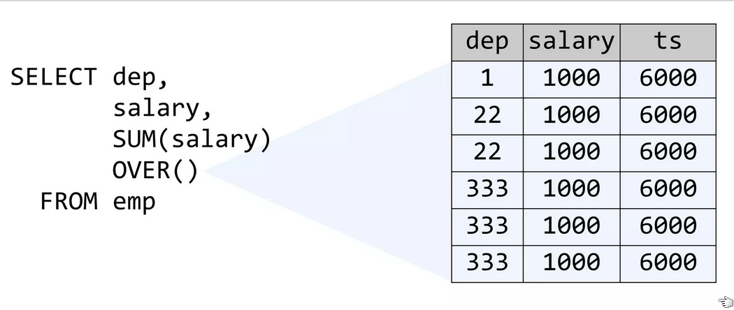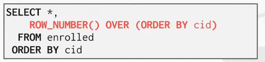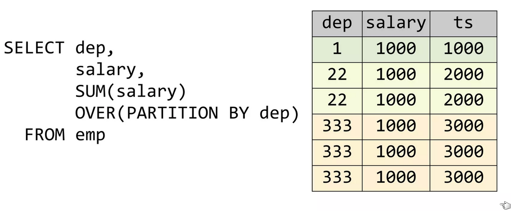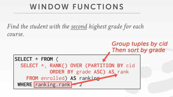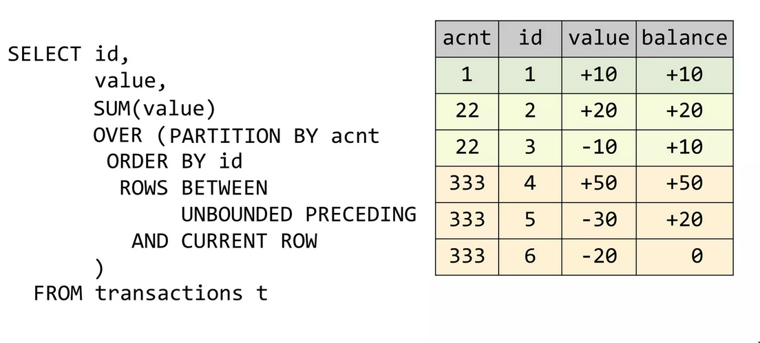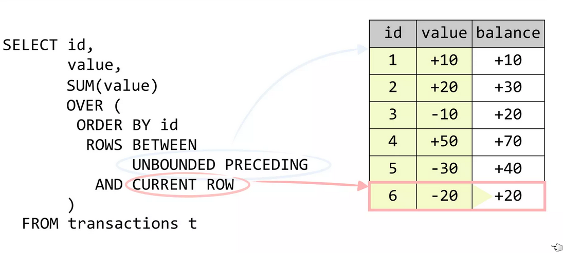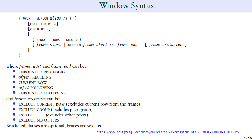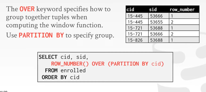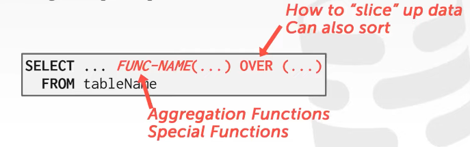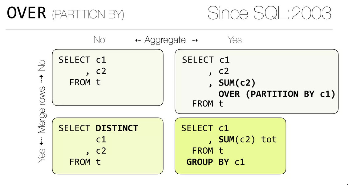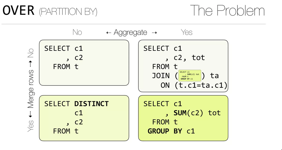ORDER BYandPARTITION BYcan be used togetherPARTITION_BYsegregates is likeGROUP_BYbut per partitionORDER_BYsegregates using range/row/group with custom frame start and end usingBETWEEN