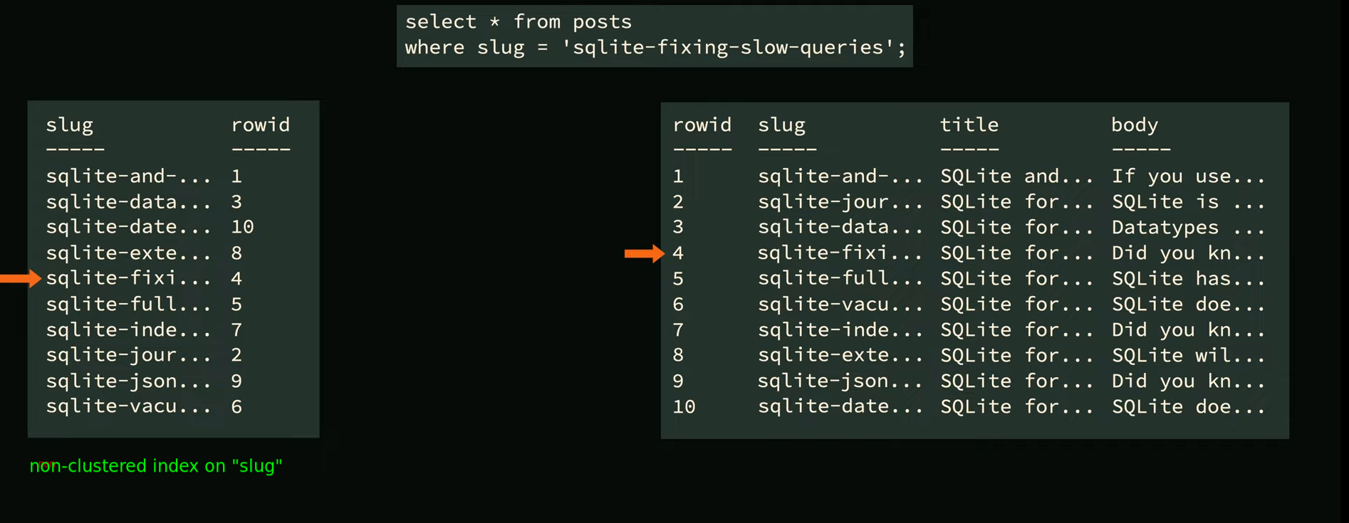 - Each row retrieval requires fetching data from both the index(btree) and the heap(table).