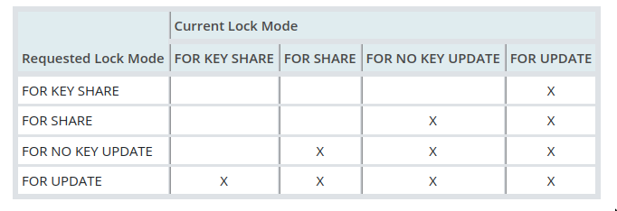 When MVCC does not suffice, application devs can use these lock modes. They’re defined by which other lock modes they