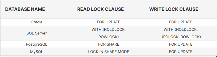 SELECT ... FOR UPDATEis the primary way to “explicitly” acquire arow-levellock. The other transaction will just wait till tx gets over.SELECT ... FOR UPDATE NOWAITsimilar toFOR UPDATE, but doesn’t wait, instead raises an errorSELECT ... FOR UPDATE SKIP LOCKEDskips any rows that are already locked by other transactions.