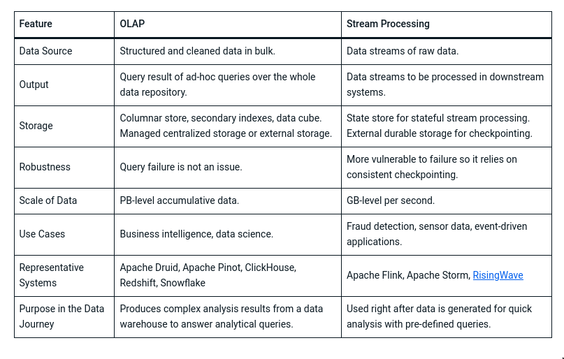 | Yes | Yes(OLAP) | Materialize DB | Yes | Sort of combines stream processing + OLAP (More powerful