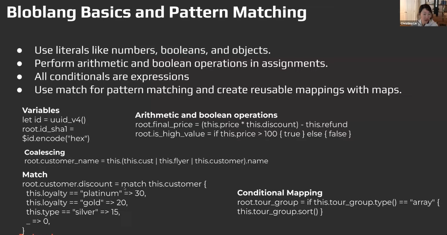 ${!<bloblang expression>} - Coalecing: root.contents = this.thing.(article | comment | share).contents | “nothing”