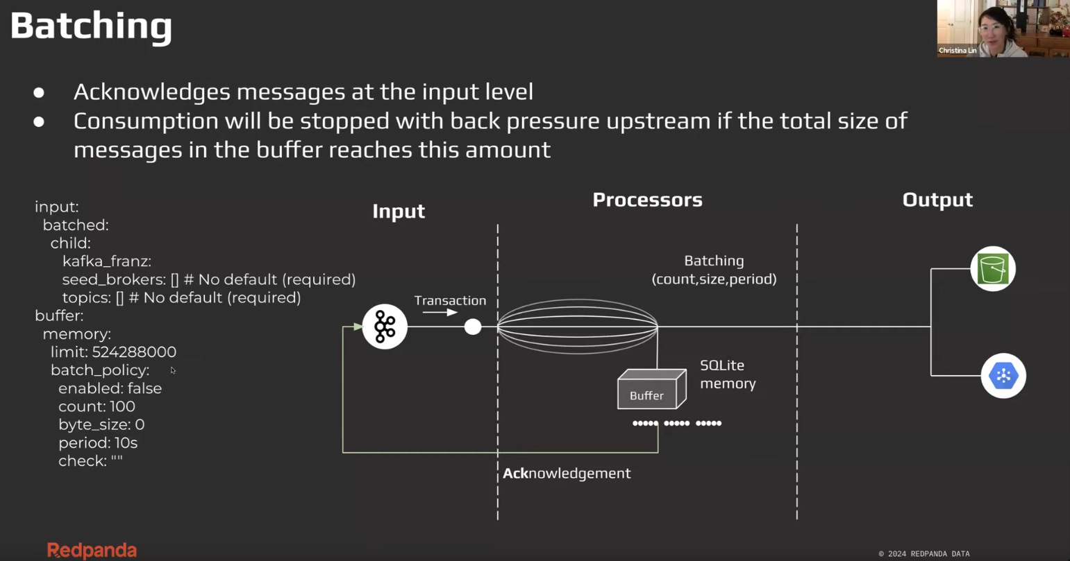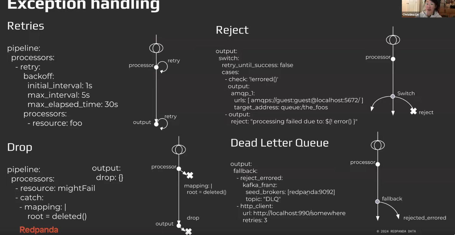 - Redpanda Connect makes a best attempt at inferring which specific messages of the batch failed, and only propagates those individual messages to the next fallback tier.