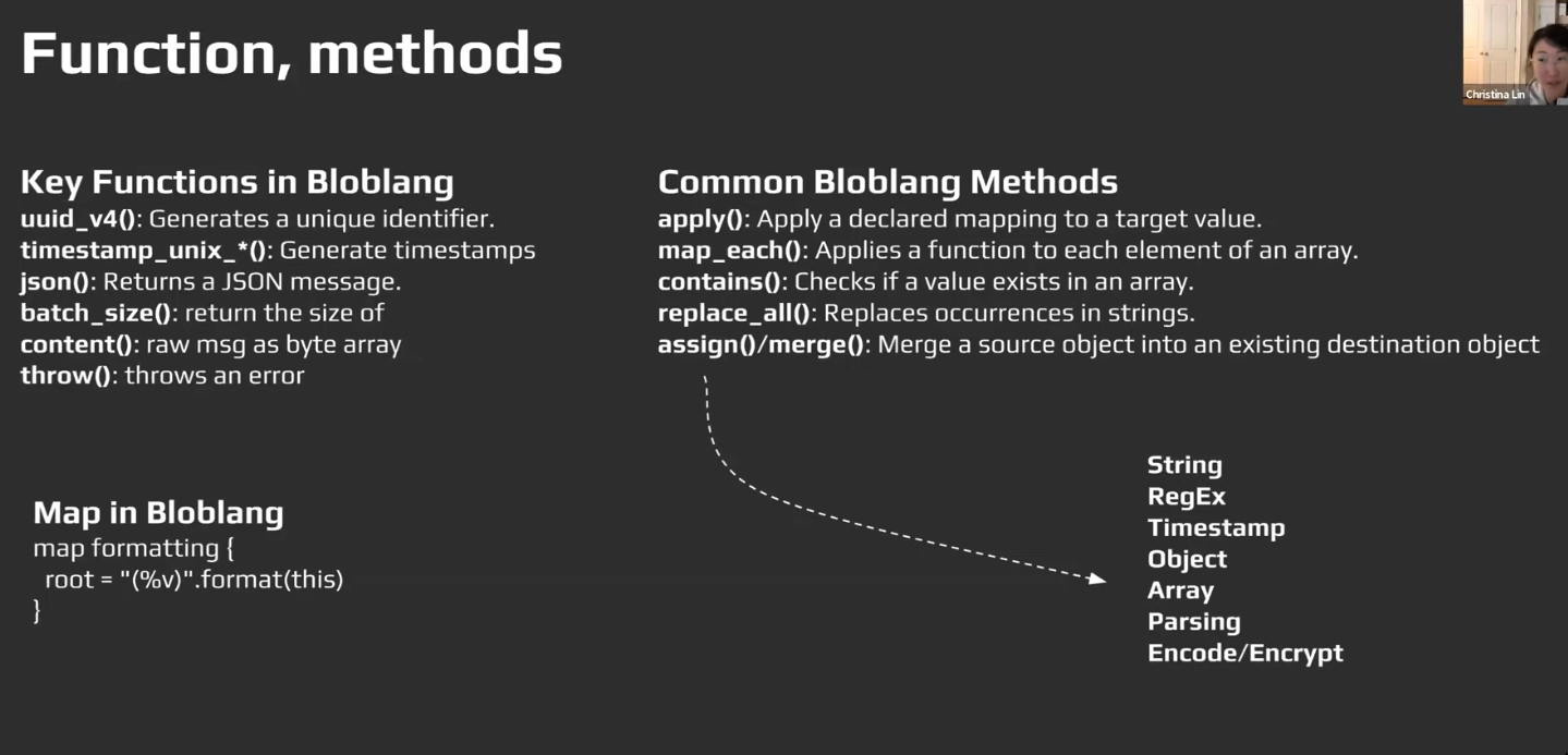 // use map for a specific case map parse_talking_head { let split_string = this.split(":") root.id = $split_string.index(0) root.opinions = $split_string.index(1).split(",") } root = this.talking_heads.map_each(raw -> raw.apply("parse_talking_head")) // apply for the whole document recursively map remove_naughty_man { root = match { this.type() == "object" => this.map_each(item -> item.value.apply("remove_naughty_man")), this.type() == "array" => this.map_each(ele -> ele.apply("remove_naughty_man")), this.type() == "string" => if this.lowercase().contains("voldemort") { deleted() }, this.type() == "bytes" => if this.lowercase().contains("voldemort") { deleted() }, _ => this, } } root = this.apply("remove_naughty_man")