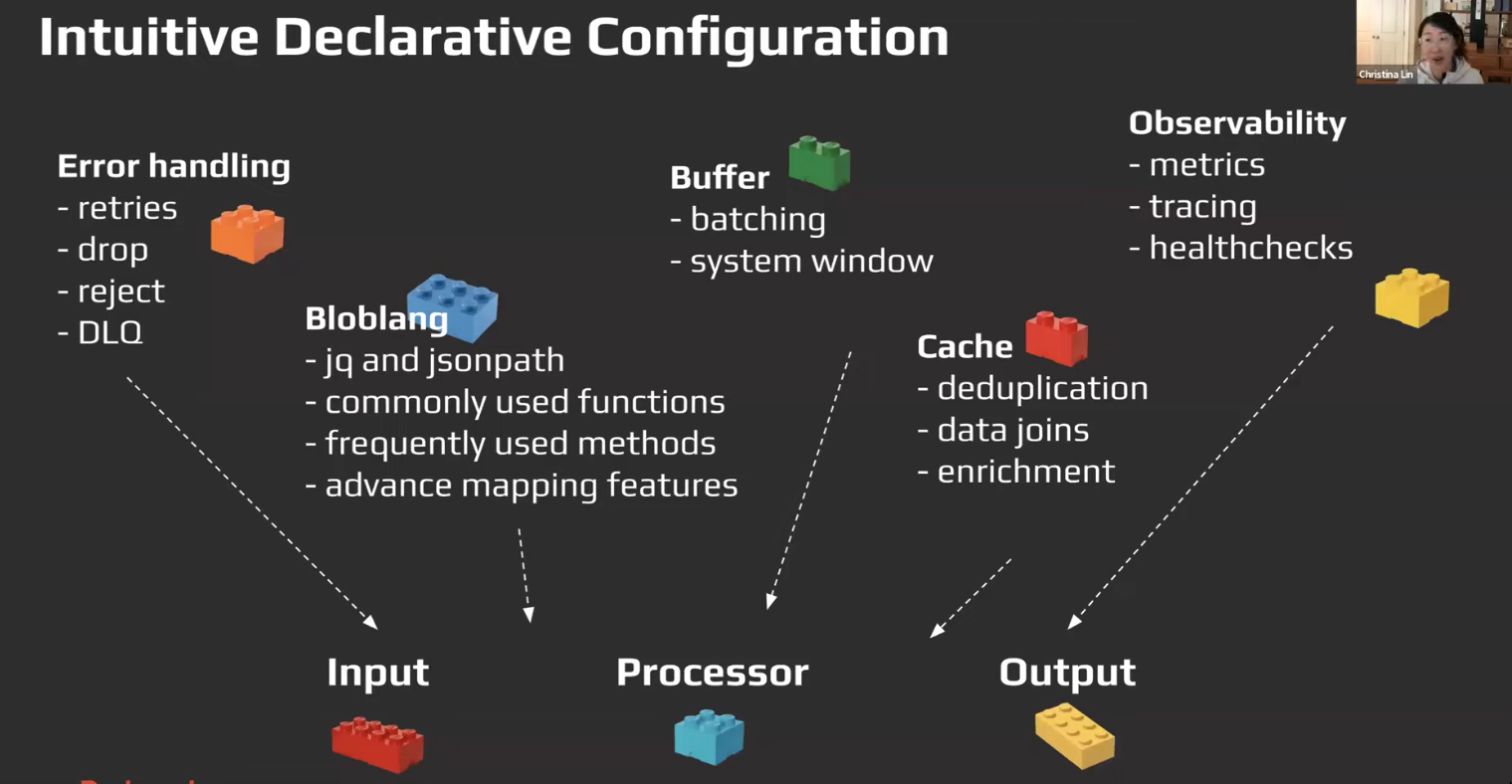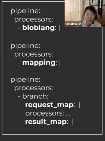 processor:bloblangprocessorr:mappingprocessor:branch:request_map/result_mapprocessor:<other processors>, eg.switchprocessor has acheckattribute which takes in a blobl query.- Output (via interpolation)