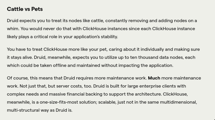 - Druid is more “true” realtime than clickhouse in this sense but that much of realtime is not usually needed in most of my cases.
