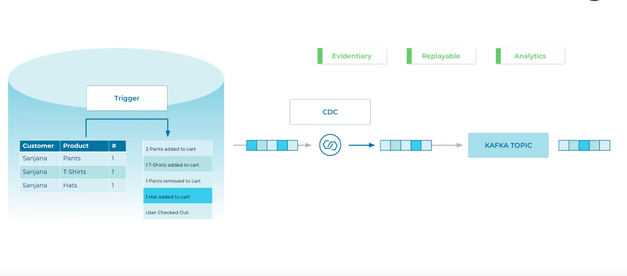 - It focuses on capturing the changes made to a data source and making those changes available to other parts of the system in a real-time or near-real-time manner.